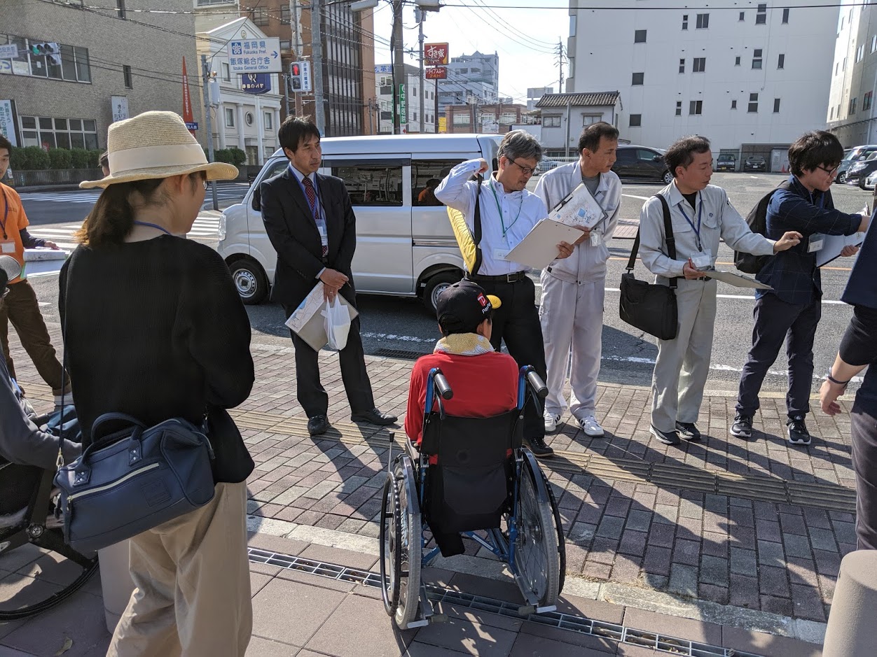 - 私たちの班は市役所から新飯塚駅周辺。聴覚・視覚障がい者の方、高齢の方、市の担当者と一緒に点検していきます。